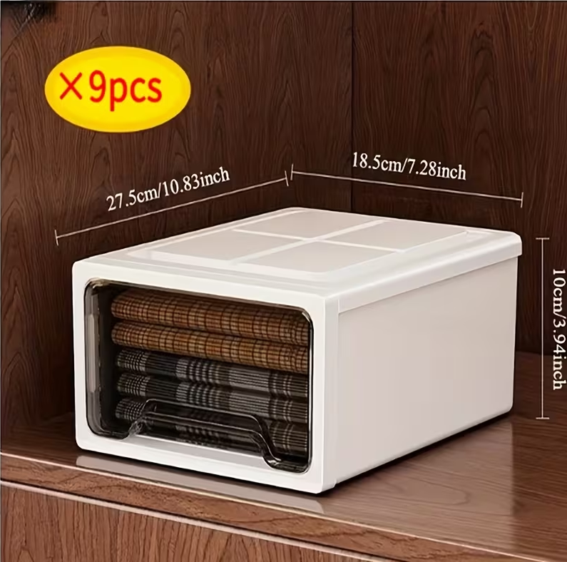 Nine modules offer wide possibilities for organizing large wardrobes, storage rooms, or open shelving. The blocks connect securely and allow tall or extended arrangements. Clear panels preserve visibility of all folded items. Each module opens smoothly and comfortably. The material supports long-term use and keeps textiles neatly shaped. The set suits those who want a broad, thoughtful system at home. The combination of modules helps use space effectively.